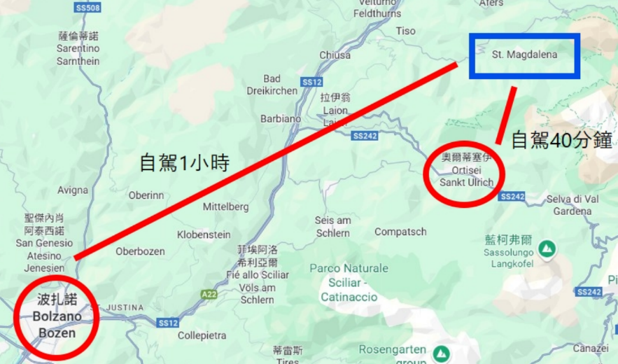 簡單分享一下孤獨的教堂和Bolzano、Ortisei的地理位置,雖然Ortisei和孤獨的教堂看起來很近,但開車過去也要40分鐘,從Bolzano過去要1小時,
